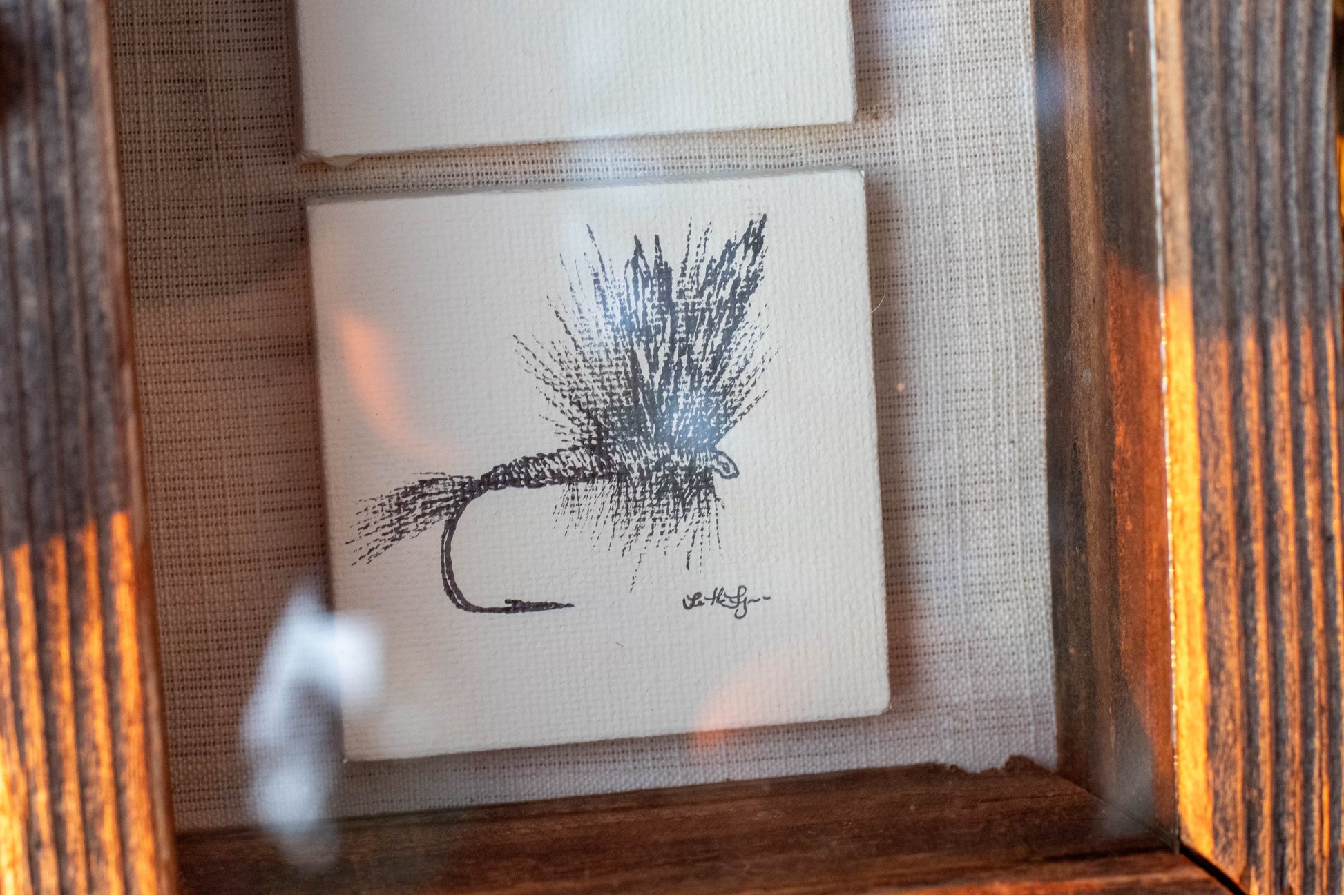 These classic hand drawn flies (top - elk hair caddis, bottom - adams) are inked and painted on two 2.75" canvases, mounted behind glass inside of a 5" x 7" shadowbox made with reclaimed wood from alibi interiors.